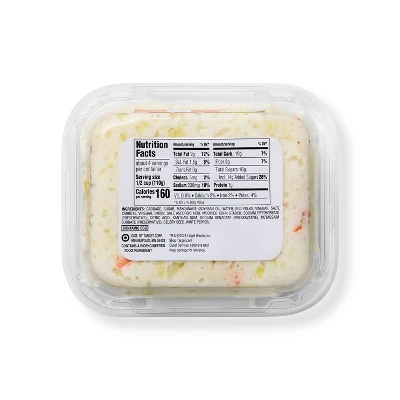 This 15-Ounce Homestyle Coleslaw from market pantry™ has cabbage, of course, but also includes carrots and onions — all in a sweet, tangy dressing. Coleslaw is a go-to favorite as a side dish with burgers, hot dogs, chicken and ribs. When the weather gets warm, the cold salads come out to play.